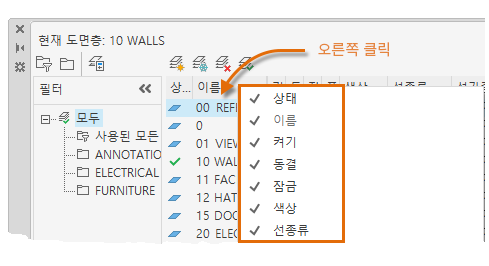 도면층 열 사용자화 대화상자를 표시합니다. 여기서 숨기거나 표시할 열을 지정하거나 열 순서를 변경할 수 있습니다.