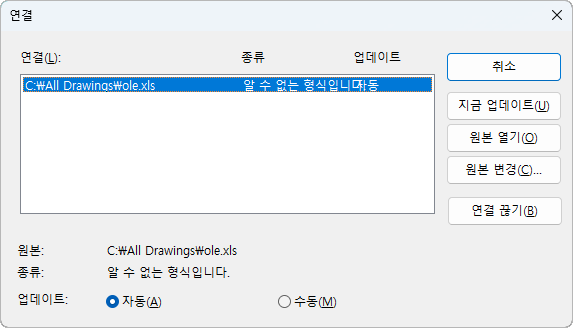 객체와 원본 파일 사이의 연결을 끊습니다. 도면의 객체가 WMF(Windows 메타파일 형식)로 변경되며 이 메타파일은 원본 파일이 이후에 변경되더라도 영향을 받지 않습니다.