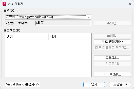 기존 프로젝트를 현재 작업 세션에 로드할 수 있는 VBA 프로젝트 열기 대화상자를 표시합니다(VBALOAD 참조).