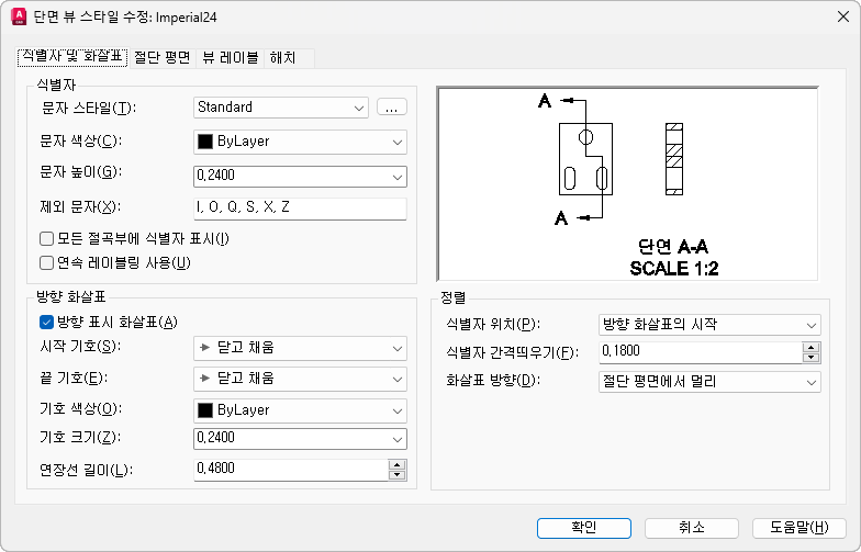 식별자 및 화살표 탭(단면 뷰 스타일 관리자)