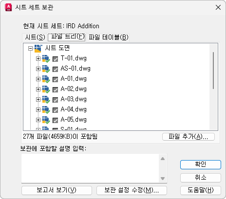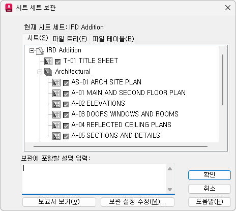 전송 패키지에 포함할 시트를 시트 순서와 하위 세트 구조에 따라 나열합니다. 시트 세트는 시트 세트 관리자에서 열어야 합니다. 최상위 시트 세트 노드를 마우스 오른쪽 버튼으로 클릭하면 표시되는 바로 가기 메뉴에서 보관을 선택하거나, 명령 프롬프트에서 ARCHIVE를 입력할 수 있습니다.