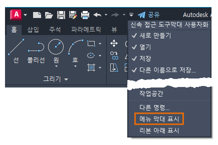 메뉴 막대는 빠른 액세스 도구 모음 드롭다운에서 사용할 수 있거나 CUI로 사용자 인터페이스를 사용자화하여 사용할 수 있습니다.