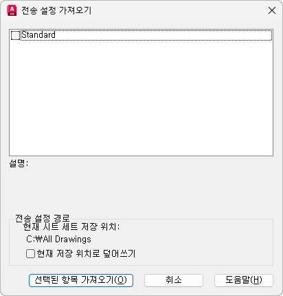 전송 설정 리스트를 표시합니다. 현재 시트 세트로 가져올 설정을 선택합니다.