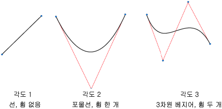 각도가 1인 곡선은 직선이며 2인 곡선은 휨을 하나 포함합니다. 베지어 곡선의 각도는 3입니다. 각도가 클수록 더 복잡한 곡선이 작성되며 계산을 수행해야 합니다.