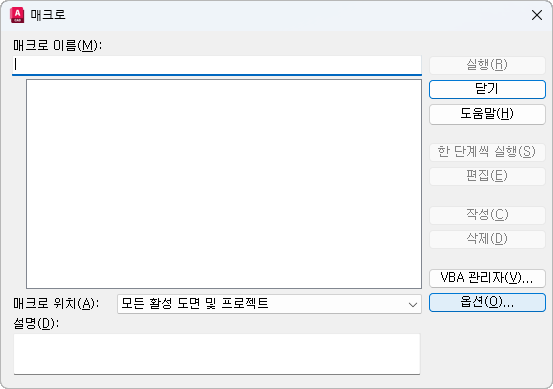 매크로 리스트에서 매크로를 사용할 수 있는 프로젝트나 도면을 지정합니다. 프로젝트나 도면이 나열되지 않은 경우 VBA 관리자를 클릭하여 로드합니다.