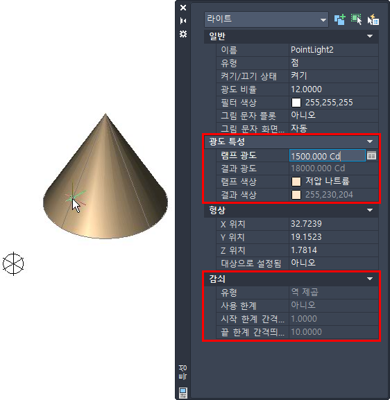 포토메트릭 조명에 대해 LIGHTINGUNITS 시스템 변수를 1(미국 단위) 또는 2(국제 SI 단위)로 설정하는 경우, 포인트 라이트에 사용할 수 있는 추가 특성이 있습니다. 다음 포토메트릭 특성은 특성 팔레트를 통해 설정할 수 있습니다.