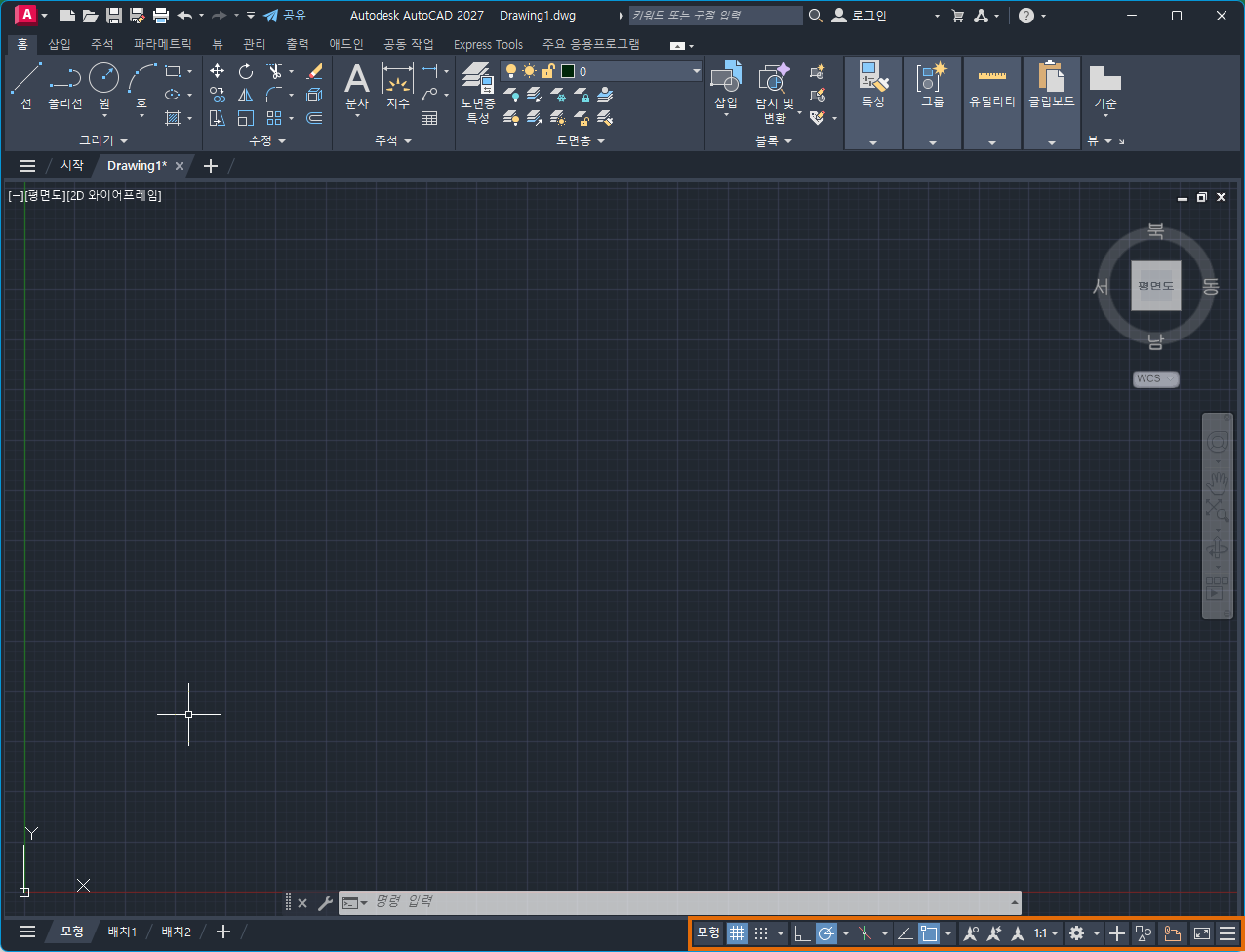 상태막대에는 도면 환경에 영향을 주는 도구, 도면 도구 및 커서 위치가 표시됩니다.
