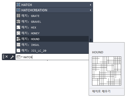 해치 이름을 선택하고 도면의 닫힌 영역 또는 객체 내부를 클릭하여 삽입합니다.