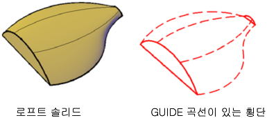 - 안내 곡선. 해당 횡단의 점과 일치시킬 안내 곡선을 지정합니다. 이 방법은 생성되는 3D 객체에 주름이 생기는 등 원치 않는 결과를 방지합니다.
