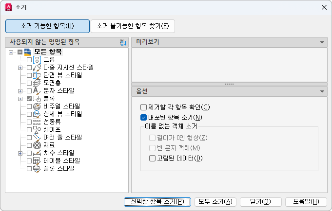 소거할 수 있는 현재 도면의 항목을 왼쪽의 트리 뷰 창에 나열합니다. 대화상자의 오른쪽에 있는 명명되지 않은 객체 소거 창 아래의 도면에서 추가 항목을 제거할 수 있습니다.