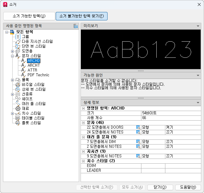 이러한 객체의 대부분은 현재 도면에서 사용되고 있거나 제거할 수 없는 기본 항목입니다. 개별 명명된 객체를 선택할 때 항목을 소거할 수 없는 이유가 표시됩니다.