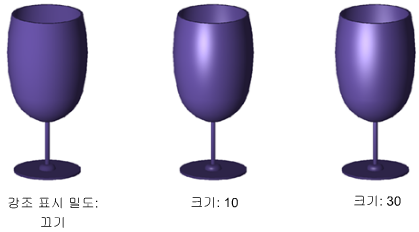 객체 강조 크기는 광택 느낌에 영향을 줍니다. 크기가 작고 강조가 강할수록 객체가 더 빛이 납니다. 비주얼 스타일에서 설정된 강조 광도는 재료가 부착된 객체에 적용되지 않습니다.