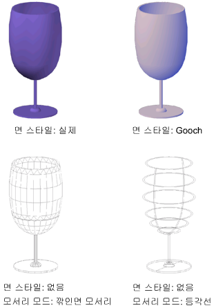 면 스타일은 면의 음영처리를 정의합니다. 사실적(왼쪽 아래)은 사실적인 효과를 생성하기 위한 것입니다. Gooch(오른쪽 아래)는 밝은 영역과 그림자 영역 사이의 대비를 부드럽게 처리하여 보다 더 세밀하게 나타냅니다. 밝은 영역은 따뜻한 색조를 사용하고 음영 영역은 차가운 색조를 사용합니다.