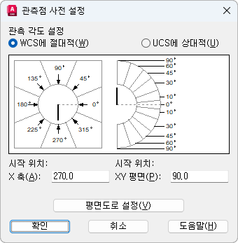 뷰 방향을 표준 좌표계(WCS) 또는 사용자 좌표계(UCS)를 기준으로 설정합니다.