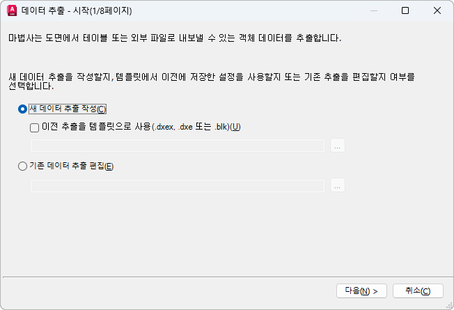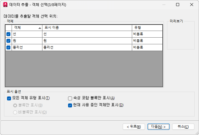 현재 도면의 객체 선택 버튼을 사용하여 데이터 추출을 위한 객체를 선택할 수 있습니다.