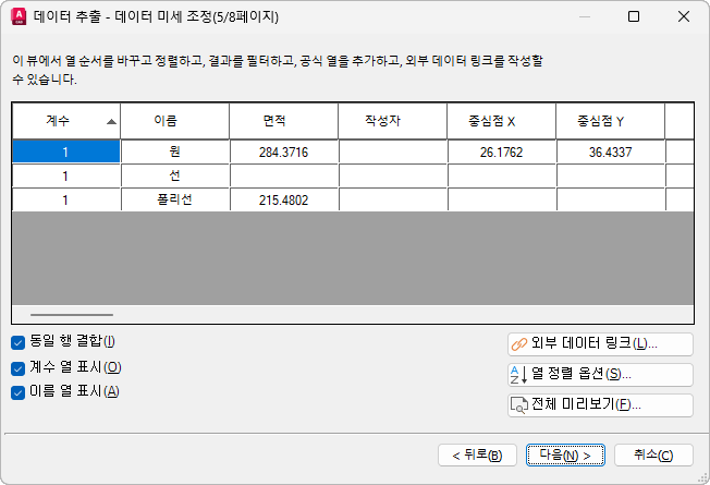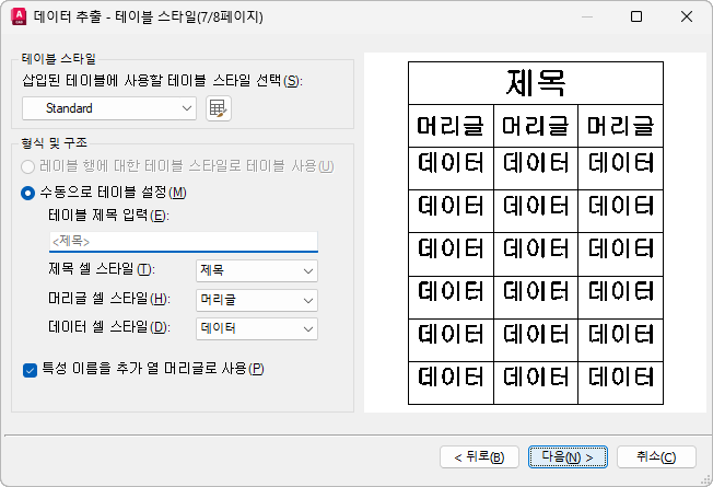 데이터 추출 테이블의 모양을 조정합니다. 이 페이지는 출력 선택 페이지에서 AutoCAD 테이블을 선택하는 경우에만 표시됩니다.