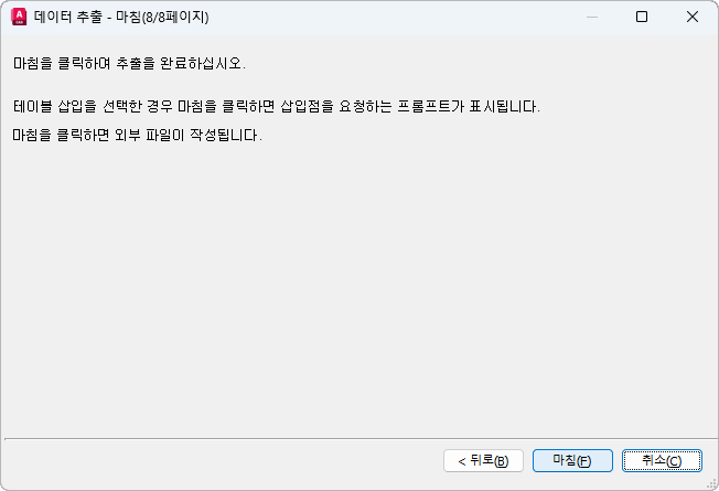 추출된 데이터로 구성된 테이블을 작성합니다. 마침 페이지에서 마침을 클릭할 경우 현재 도면에 테이블을 삽입하라는 프롬프트가 표시됩니다.