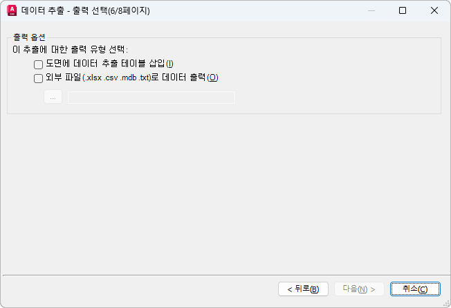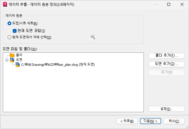 데이터 추출에 현재 도면을 포함합니다. 추출을 위해 추가 도면이 선택된 경우 현재 도면은 비어 있을(객체를 포함하지 않을) 수 있습니다.