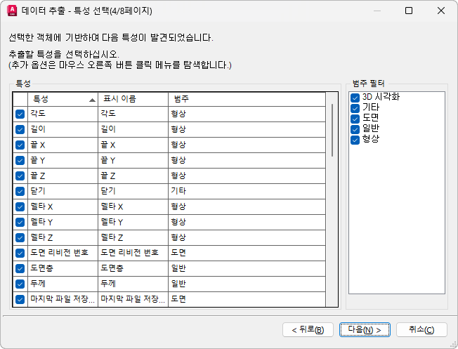 추출할 객체, 블록 및 도면 특성을 조정합니다.