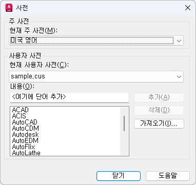 현재 사용자 사전의 이름을 표시합니다. .cus 확장자는 AutoCAD 사용자 사전에 사용됩니다.