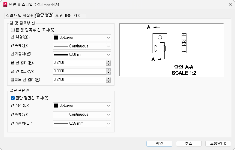 - 절단 평면 선의 선가중치를 설정합니다. 모든 절단 평면 선 세그먼트가 동일한 선가중치를 사용합니다.