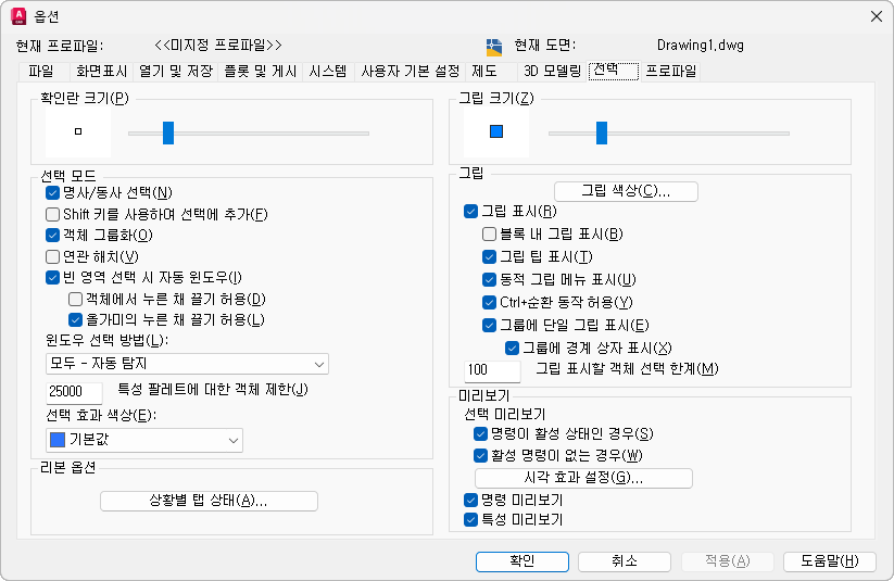 명령을 호출하기 전에(명사-동사 선택) 객체를 선택할지 또는 호출한 후에 선택할지 여부를 조정합니다. (PICKFIRST 시스템 변수)