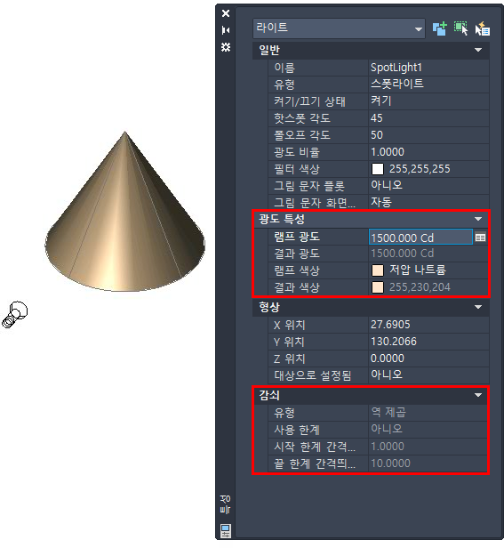 다음 이미지는 특성 팔레트에 명시된 포토메트릭 특성이 포함된 포토메트릭 스폿라이트의 예입니다.