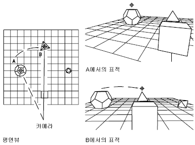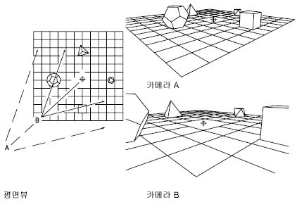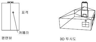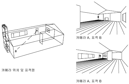 카메라 및 표적을 사용하여 평행 투영 뷰 또는 투시도를 정의합니다.