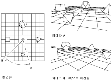 이 그림은 XY 평면으로부터의 각도를 변경하지 않고 카메라를 처음 위치에서 왼쪽으로 회전한 효과를 보여줍니다.