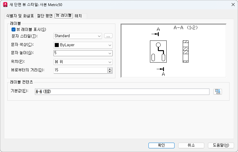 - 단면 뷰 레이블에 사용할 문자 스타일을 설정합니다.