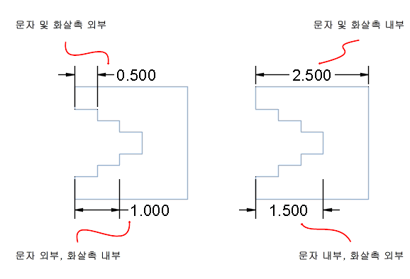 화살촉이 치수보조선의 외부에 있는 경우에도 치수선이 치수보조선 사이에 그려지도록 할 수 있습니다.