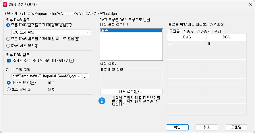 표준은 내보낼 도면에서 데이터를 추출하고, 매핑 미리보기에 표시된 대로 DGN 도면층, 선종류, 선가중치, 색상에 자동 매핑을 적용하는 기본 매핑 설정입니다.