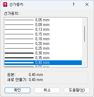 이전 선가중치를 표시합니다. 도면층이 작성될 경우 지정되는 기본 선가중치는 DEFAULT입니다(기본값인 0.01인치 또는 0.25mm로 플롯). (LWDEFAULT 시스템 변수)