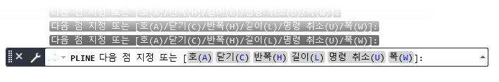 기본적으로 명령 윈도우에는 단일 프롬프트 행이 표시됩니다. 명령이 진행 중인 동안 임시 프롬프트 사용 내역이 명령 윈도우 위에 표시됩니다. 여러 점 또는 옵션(예: PLINE)을 사용하여 단일 명령에 대한 프롬프트 사용 내역에 표시되는 최대 행 수를 변경하려면 이 방법을 사용합니다.