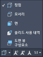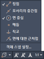 | 찾기 | 2D 객체 스냅 | 커서를 움직임에 따라 커서를 가장 가까운 2D 참조점으로 스냅합니다. 끝점, 원의 중심, 중간점 등을 예로 들 수 있습니다. |