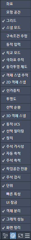 상태막대에서는 도면환경에 영향을 주는 도구에 빠르게 액세스할 수 있습니다.