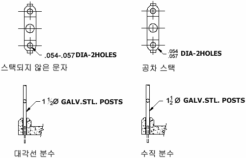 스택 문자는 여러 줄 문자 객체와 다중 지시선 내 문자에 적용된 분수 및 공차 형식을 나타냅니다. 분수 및 공차를 나타내는 문자를 여러 표준을 따르도록 형식화할 수 있습니다.