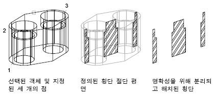 3D 솔리드 객체를 가로지르는 평면형 횡단을 나타내는 2D 영역 객체를 작성할 수 있습니다. 이 방법을 사용할 때는 라이브 단면 기능이 없습니다.