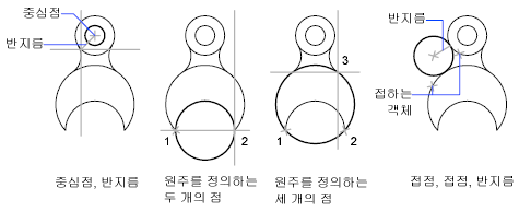 원을 작성하는 경우 중심점, 반지름, 지름, 원주의 점 및 다른 객체의 점을 다양하게 조합하여 지정할 수 있습니다.