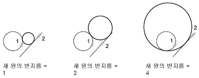 접점은 객체가 다른 객체와 교차하지 않고 만나는 점입니다. 다른 객체에 접하는 원을 작성하려면 객체를 선택한 다음 원의 반지름을 지정합니다. 아래 그림에서는 굵은 원이 그려지고, 점 1 및 2는 접하는 객체를 선택합니다.