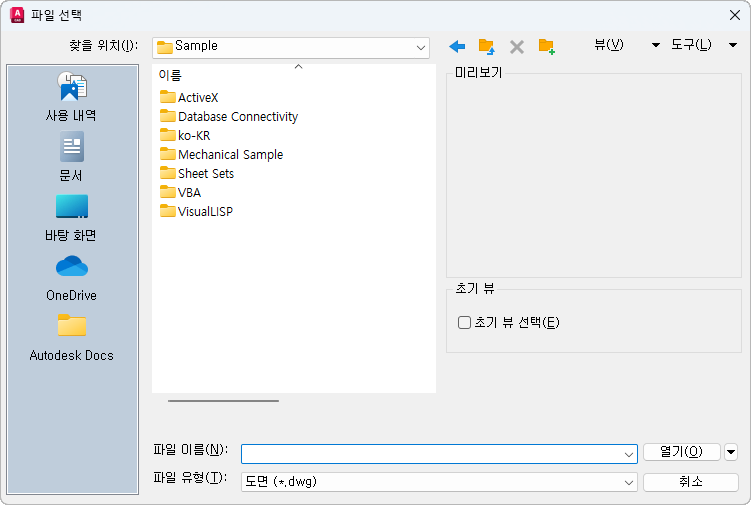 미리보기를 선택하면 선택한 파일의 비트맵이 표시됩니다. 도면 파일과 함께 비트맵을 저장하려면, 옵션 대화상자의 열기 및 저장 탭에서 썸네일 미리보기 이미지 저장 옵션을 사용합니다.
