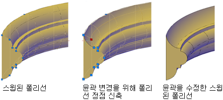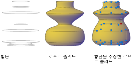 정의하는 선 또는 곡선에 있는 그립을 끌어 쉐이프를 수정합니다. 객체가 경로를 따라 로프트된 경우에는 첫 번째와 마지막 횡단 사이에 있는 경로 부분만 편집할 수 있습니다.