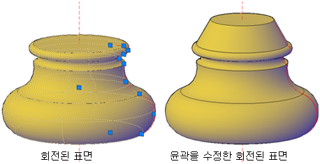 회전 솔리드 및 표면은 회전 솔리드 또는 표면의 시작 시 회전 프로파일의 그립을 표시합니다. 이 그립을 사용하여 표면 솔리드의 프로파일을 수정할 수 있습니다.