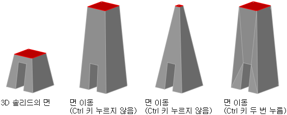- 면 이동. 면을 이동할 때 끌면서 Ctrl 키를 한 번 눌렀다가 놓으면 면의 위치는 인접면의 경계(점유 면적) 내에서 수정됩니다.