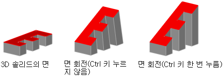 - 인접면 연장. Ctrl 키를 누르지 않은 상태에서 면을 이동하거나 회전하면 면의 형태 및 크기가 유지됩니다. 하지만 인접면의 평면은 변경될 수 있습니다.