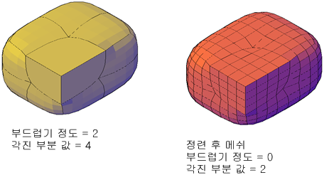 메쉬 객체를 정련하면 면의 수가 증가할 뿐만 아니라 부드럽기 정도가 다시 기준으로 재설정됩니다. 따라서 객체가 부드럽게 된 것으로 보일 수 있지만, 부드럽기 정도는 여전히 0입니다.