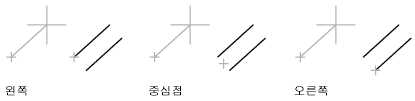 끌기선은 이중선의 배치를 결정하는 러버밴드 선입니다. 이중선이 중심에 배치되는지 여부나 끌기선의 오른쪽 또는 왼쪽으로 간격띄우기되는지 여부를 조정할 수 있습니다.