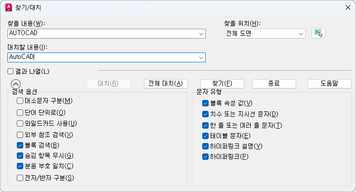 찾을 위치 설정은 찾기 및 대치를 전체 도면에서 수행할지 아니면 현재 선택한 객체에서 수행할지를 조정합니다.
