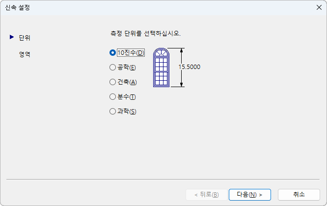 신속 설정 마법사에는 두 개의 페이지, 즉 단위와 면적이 있습니다. 신속 설정 마법사에서 작업할 때는, 뒤로와 다음을 선택하여 페이지 사이를 전환하고 마지막 페이지에서 마침을 선택하여 마법사를 닫은 다음 지정한 설정을 가진 새 도면을 작성합니다.
