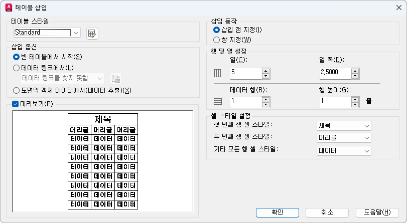 테이블의 크기와 위치를 지정합니다. 좌표 입력 장치를 사용하거나 명령 프롬프트에 좌표 값을 입력할 수 있습니다. 이 옵션을 선택한 경우, 열과 행 수 및 열 폭과 행 높이는 윈도우의 크기와 열 및 행 설정에 따라 달라집니다.